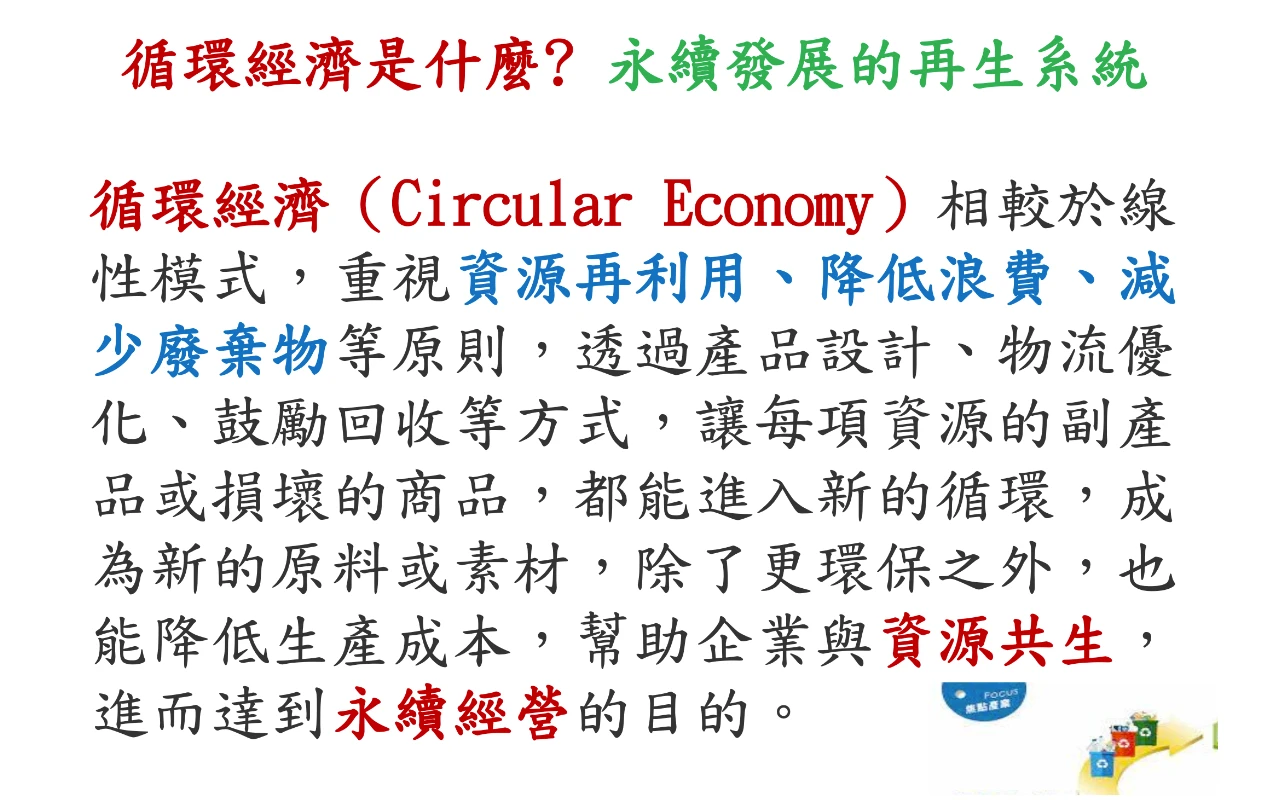 在節能減排的問題處理中,用循環經濟的作法是可有效的解決。3R的觀念已經深入在所有消費者心中,並且大家身體力行。但要如何擴大執行面,還有需各企業的共同努力