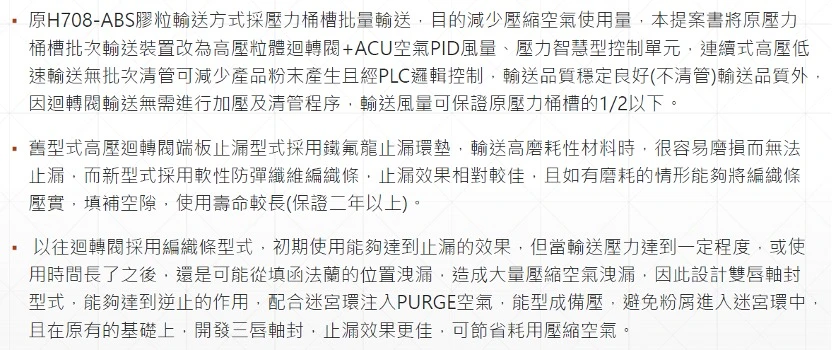 台塑集團新港廠區 XX廠塑膠粒空氣輸送改善案:結論是可達到原用氣量節省50%以上的效益。