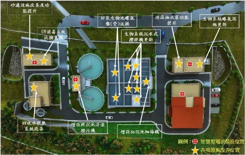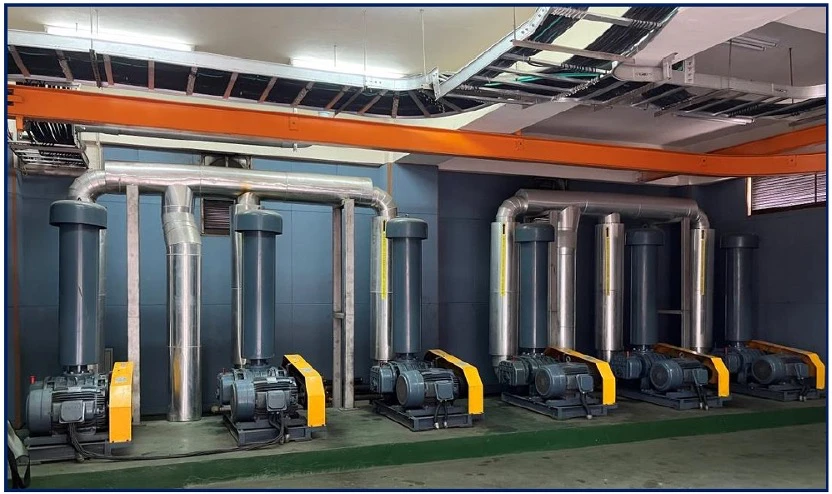 將原有操作中之6部魯式鼓風機(30Hp),汰換更新掉2部魯氏鼓風機以符合操作現況下,汰換為2部單段離心式鼓風機(75Hp)(規格為:風量:47CMM,風壓:6000mmAq),並設置變頻器及風壓控制設施,可進行風壓及風量調節,若未來處理水量增加可依需求調節進行多機運轉及交替使用。