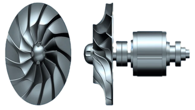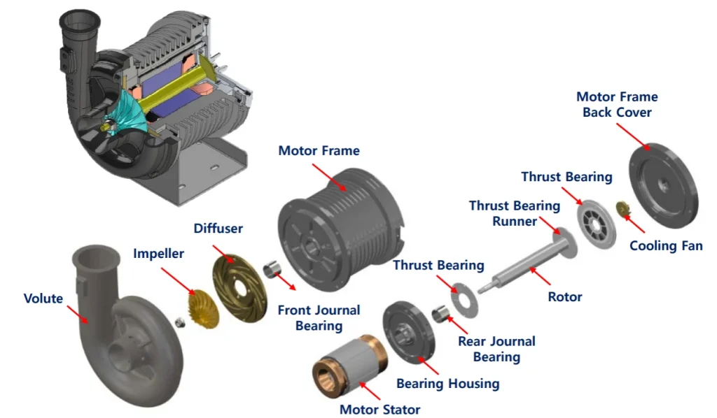 利用空氣在鼓風機轉子在高速旋轉下,使得轉子與箔片軸承表面之間產生動壓效應下,形成一個高壓氣膜,進而將轉子托浮起來的一種鼓風機。